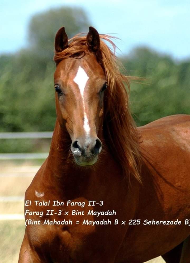 Farag II-3 (Farag II x 204-Ghalion). Foaled in 1987. Foundation stallion of Farag Arabians until his death in 2016. His dam, 204-Ghalion, is a daughter of 3-Siglavy Bagdady VI.Farag II-1 (Farag II x 238-Rajan). The foundation mare of Farag Arabians, foaled in 1991. Her dam is another daughter of 3-Siglavy Bagdady VI. Arzu-Melina Bint Farag (Farag II-3 x Farag II-1). Foaled 2013.Taza Bint Farag II-3 (Farag II-3 x Farag II-1). Foaled 2015.Sahil Ibn Farag II-3 (Farag II-3 x Souha). Foaled 2010. His dam, Souha, is from Marbach, and traces tail female to Murana I.S.B. Mabrouka (Wahhabit x Mabrouk-1). Foaled in 1996. Her dam traces in tail female to 25-Amurath Sahib via 3-Siglavy Bagdady VI, while her sire is a son of Siglavy Bagdady VI out of the Davenport mare Delicate Air. Sahil Ibn Farag II-3 and S.B. Mabrouka. Mabrouka is expecting a foal by Sahil.Farida Bint Farag II-3 (Farag II-3 x Rashida P). Foaled 2011. Her dam, Rashida P, traces tail female to 25-Amurath Sahib via 3-Siglavy Bagdady VI.El Talal Ibn Farag II-3 (Farag II-3 x Bint Mayadah). Foaled 2013, now a gelding. His dam, Bint Mayadah, traces back in tail female to 25-Amurath Sahib through her daughter 20-Farag.
