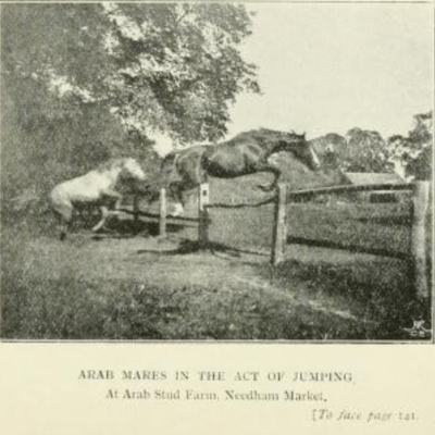 These mares are at the Arab Stud Farm in Needham Market, which is, of course, the farm of the Rev. F. F. Vidal. I’m not surprised that they’re jumping at his farm. Naomi herself was said to be quite a successful hunter in England before being imported overseas to Huntington’s farm – I know I’ve read it in a periodical source somewhere, but the easy example is the Allbreed info citing her as “An exceptional and widely-acclaimed field hunter known for clearing 7-foot fences carrying 196 lbs.”