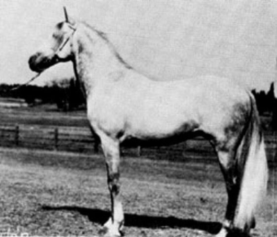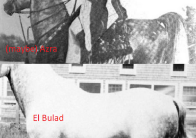 5. Several of us have been debating this image for a while now. For it to be *Azra, the contemporary images of him as a light grey must be mis-identified. Unless there is another unknown stallion in this narrow time window, the only one dark enough to be this horse is indeed *El Bulad.