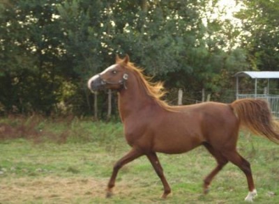 Following the discussion about the Jahir son Murad Ghazi, below, I found the following photos online, of his half brother Djelid (Jahir x Djenissa, by Doum x Djayda, by Shawani x Miloudia, by Moulouki x M’Rabbia, by Saadi x Hammada by Madani), a stallion in central France, who is bred very closely within the Mauvy lines, with three lines to the Mauvy foundation mare Zarifa, two to Izarra, and one in the tail female to Hammada, the latter two coming from the Cordonnier stud in Tunisia. His strain is Mukhallad (Mokladie, as spelled in French), tracing to Merjane, imported to France from the Naqab/Sinai desert.
