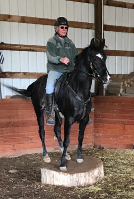 The 2014 son of my DA Ginger Moon (“Ginger”), gone to endurance rider Chris Yost (photo), is now training for the Tevis Cup 100 miles ride, and has turned into a magnificent black stallion. I had named him Kanz Al Arab, but he is now registered as DA El Moubarak BLY (“Mou”).