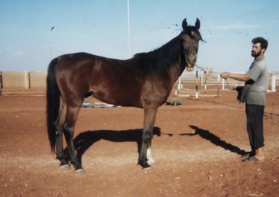 Amoori (Al-Aawar x Ghallaieh, by the black Saqlawi Marzakani, the “horse of Al-‘Anud”) is a full brother to Amshet Shammar, pictured below. He was bred by Radwan Shabareq in Aleppo, from a mare bred by Rakan al-Jarba of the Shammar Bedouins, from a line originating from the Tai leaders, in turn originating from the Fad’aan Bedouins. This is the same line that produced the Kuhaylan Ibn Mizhir horses. The photo comes from Arnault Decroix who took it in 2000.